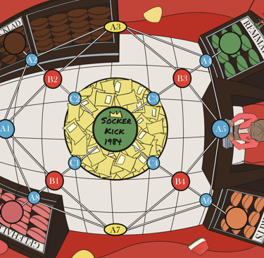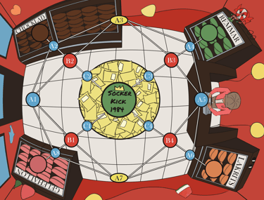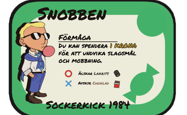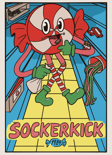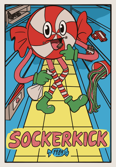 Sockerkick is an analog board game designed for future release at Akademibokhandeln. The game is based on a significant moment in Swedish history when self-service candy was introduced in 1984, allowing customers to pick their own sweets instead of waiting for staff behind the counter.
